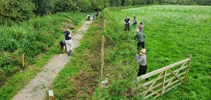 On the 31st of August, a determined team of no less than 11 braved the gray skies and drizzle to assist the Cheshire East Rangers. This year’s task was to clear as much of the overgrown fence that lined the path around Alsager Borrow Pit Meadows so that maintenance teams could access and repair the fence itself.